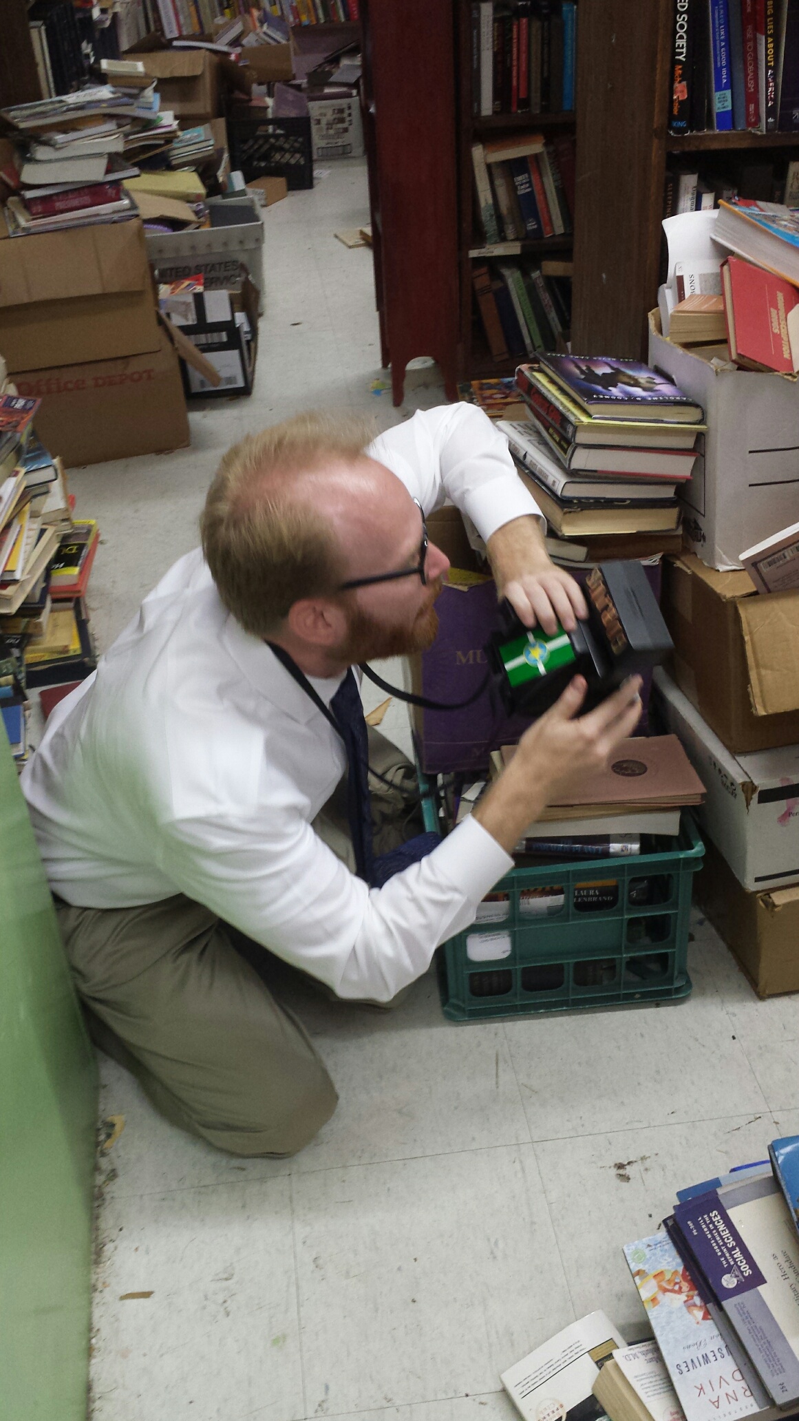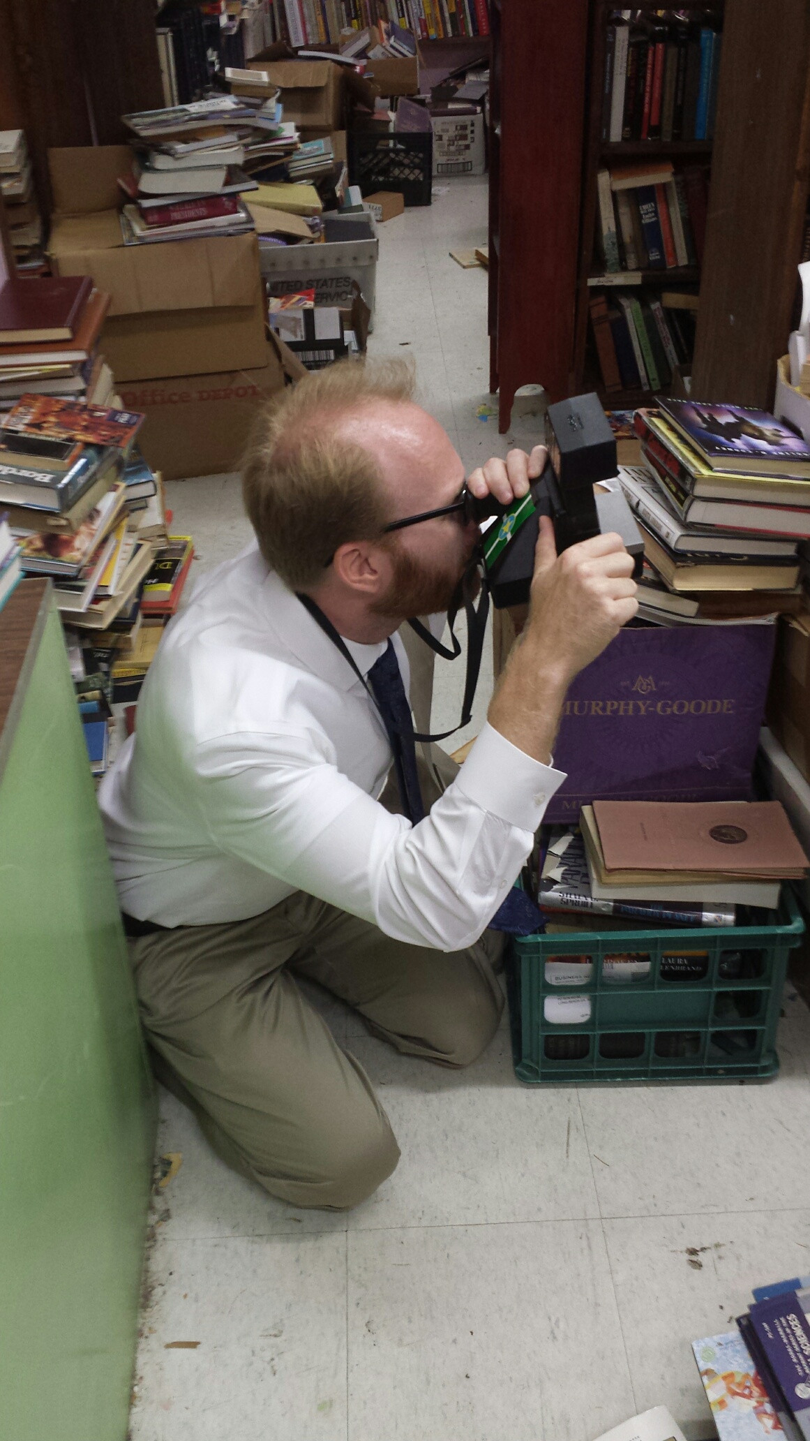 And, unlike any photographer I had previously been around, David did not mind at all that I wished to snap photographs of him working. I was taking leave time to do this (one year ago, according to David’s records). Somehow, when we arrived at Choctaw Books, we exited the real workaday world and entered a solar system entirely of David’s making. In the looming stacks, I followed David’s lead and gave myself to his sway—it was crazy, ridiculous to think that I was a writer worthy of an art photographer’s time. But I could tell as I watched him and photographed him, David McCarty was very serious about this. He thought I was a subject of which art could be made.
